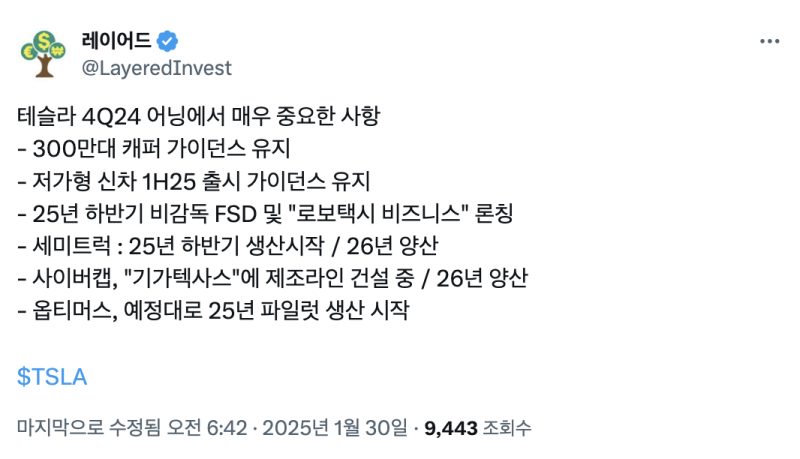 테슬라의 2024년 4분기 어닝 발표는 긍정적인 성과를 보여주었습니다. 매출과 영업이익 모두 증가했으며, 향후 계획도 매우 긍정적입니다. 테슬라가 전기차 시장에서의 리더십을 유지하기 위해 지속적으로 혁신하고 있다는 점은 매우 고무적입니다. 앞으로의 성장이 기대되는 만큼, 투자자들은 테슬라의 동향을 주의 깊게 살펴봐야 할 것입니다.