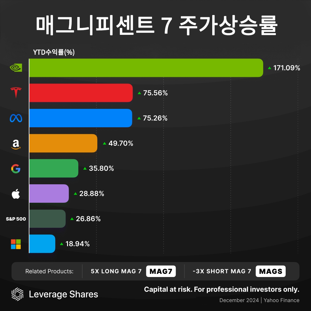 M7 그룹은 애플, 엔비디아, 마이크로소프트, 메타, 테슬라, 알파벳, 아마존 등으로 구성되어 있습니다. 이들 기업은 최근 몇 년간 높은 성장률을 기록하며 투자자들에게 큰 관심을 받고 있습니다. 특히 엔비디아는 AI와 관련된 기술로 인해 주가가 급등하며, 2024년에는 171.09%의 성장을 기록했습니다.