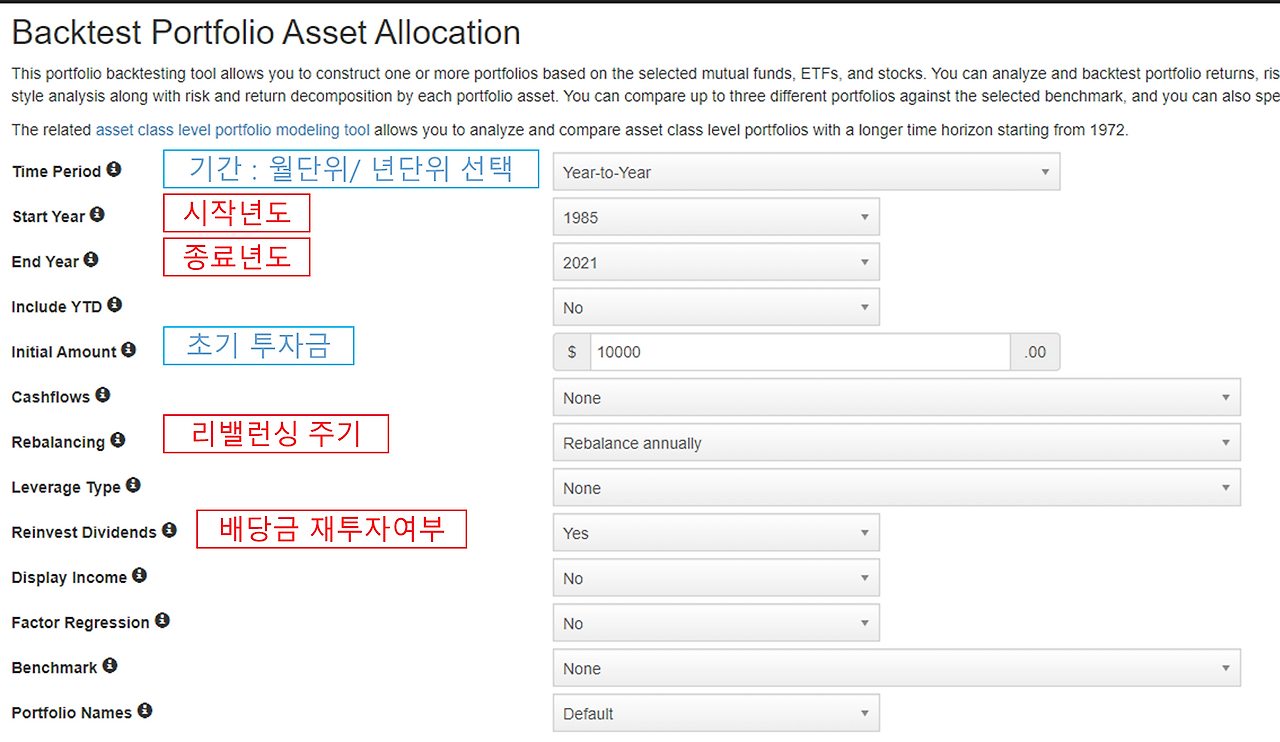 와 같은 다양한 입력 필드를 통해 분석할 포트폴리오의 조건을 설정할 수 있습니다. 예를 들어, 투자 기간, 초기 투자 금액, 자산 배분 비율 등을 입력하여 원하는 포트폴리오를 구성할 수 있습니다.